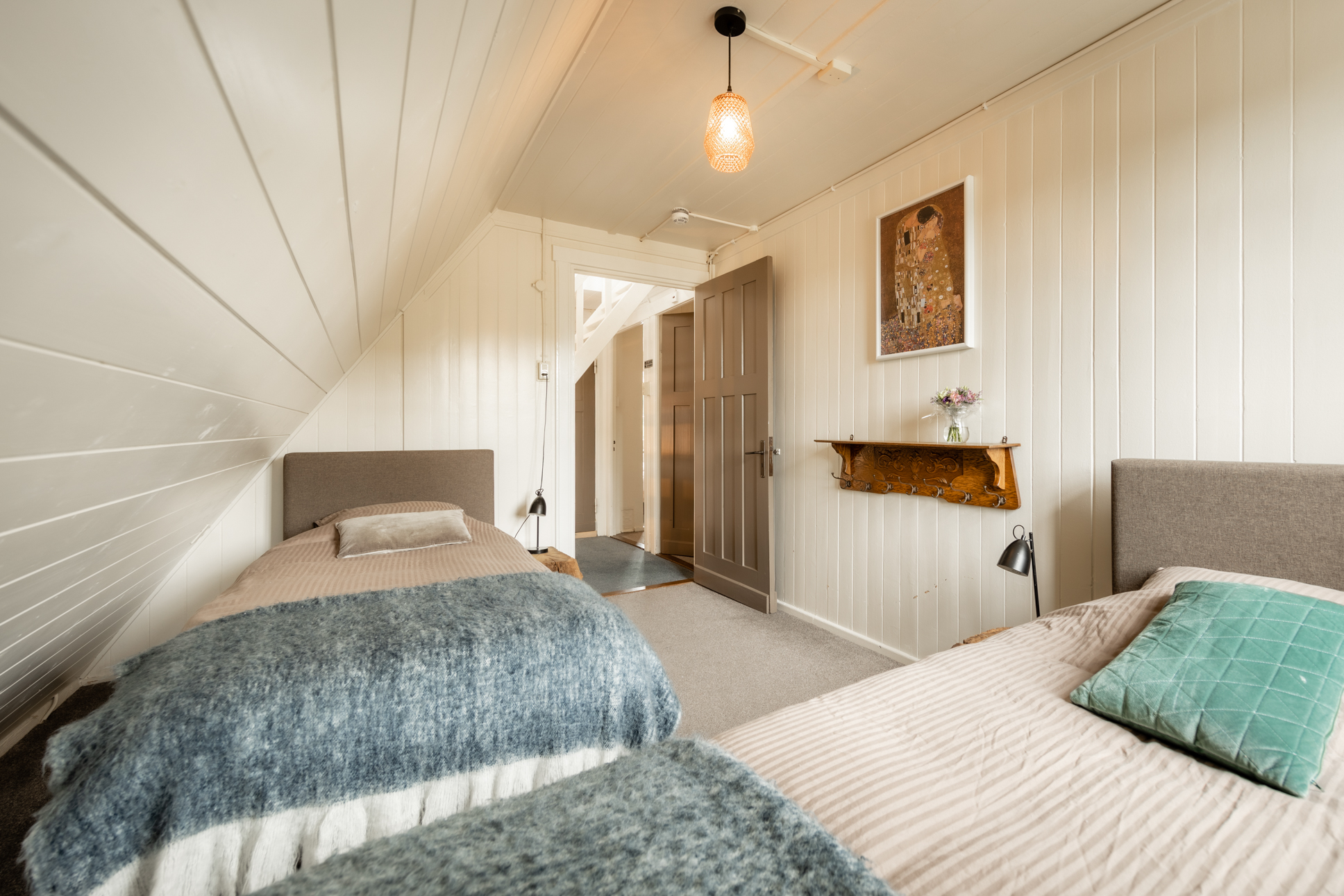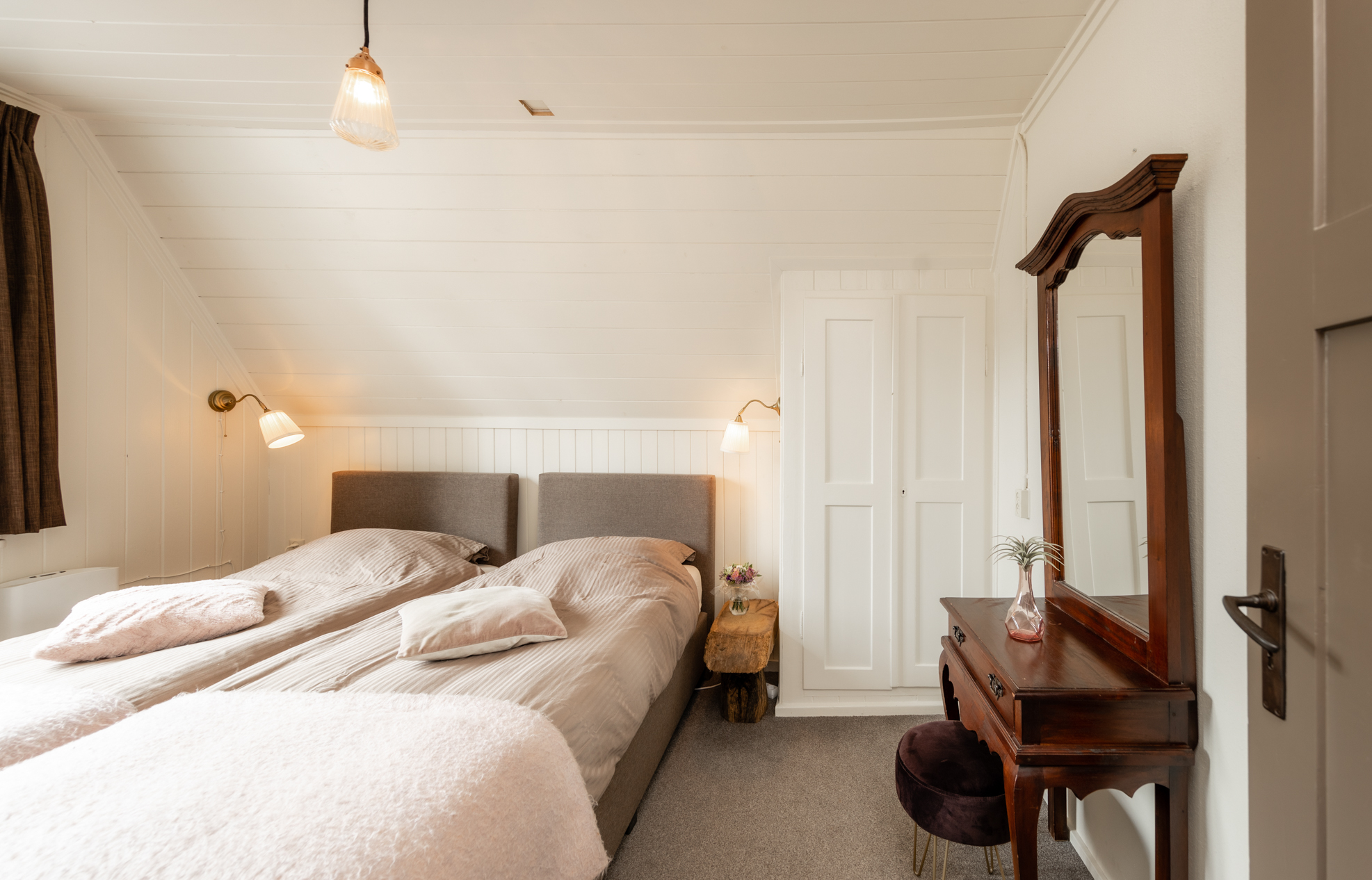 Op de tweede verdieping bevinden zich de twee laatste kamers, ieder met een groot ingebouwd tweepersoonsbed (1.80x2.10).
