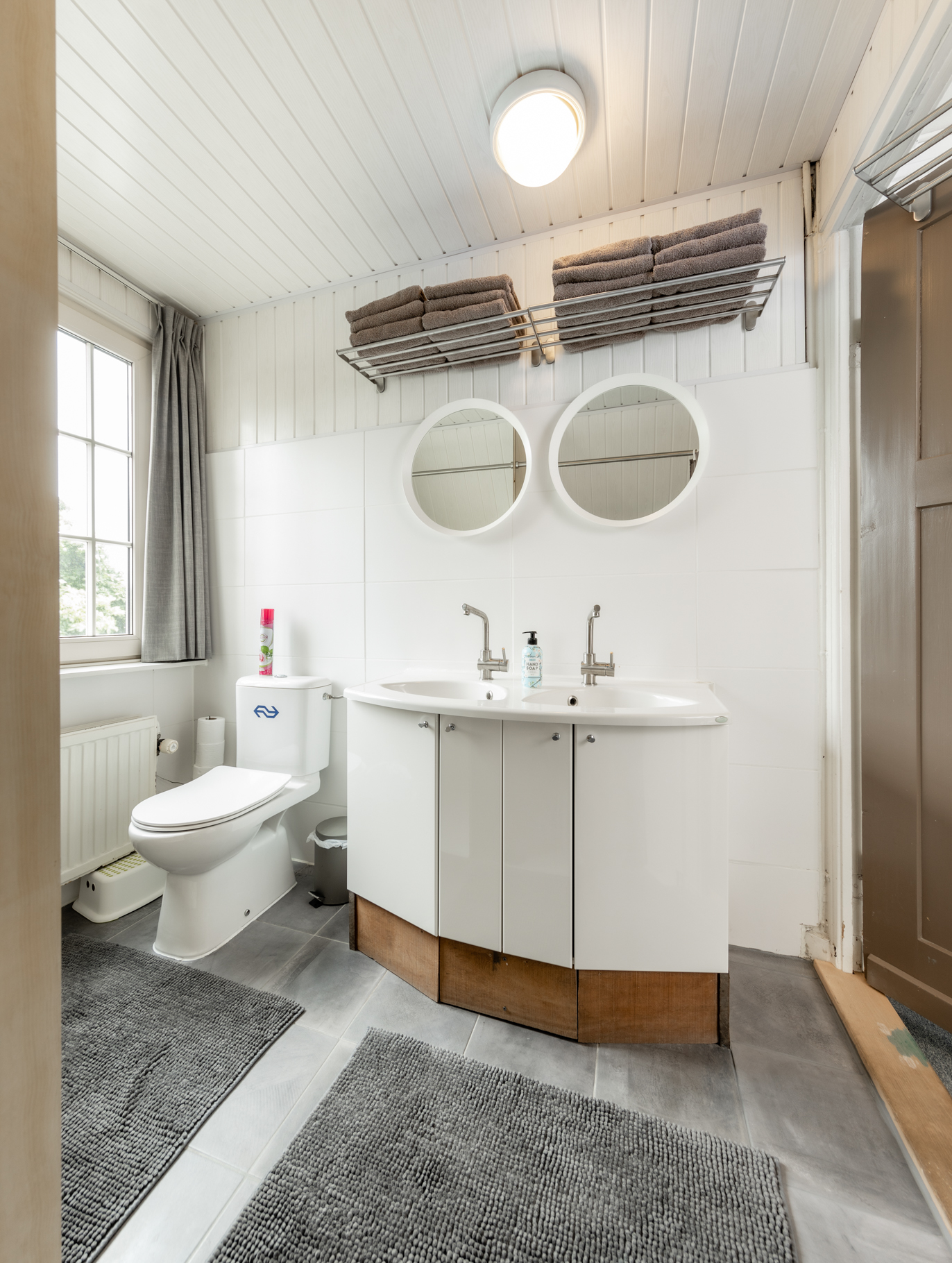 Op de eerste verdieping bevindt zich de badkamer met dubbele douche en dubbele wastafel. Daarnaast vindt u hier de drie eerste slaapkamers. Twee tweepersoonskamers met losse bedden (90x2.00) en een vierpersoonskamer met ingebouwd stapelbed (4x 80x2.00). De kinderen zullen het prachtig vinden!